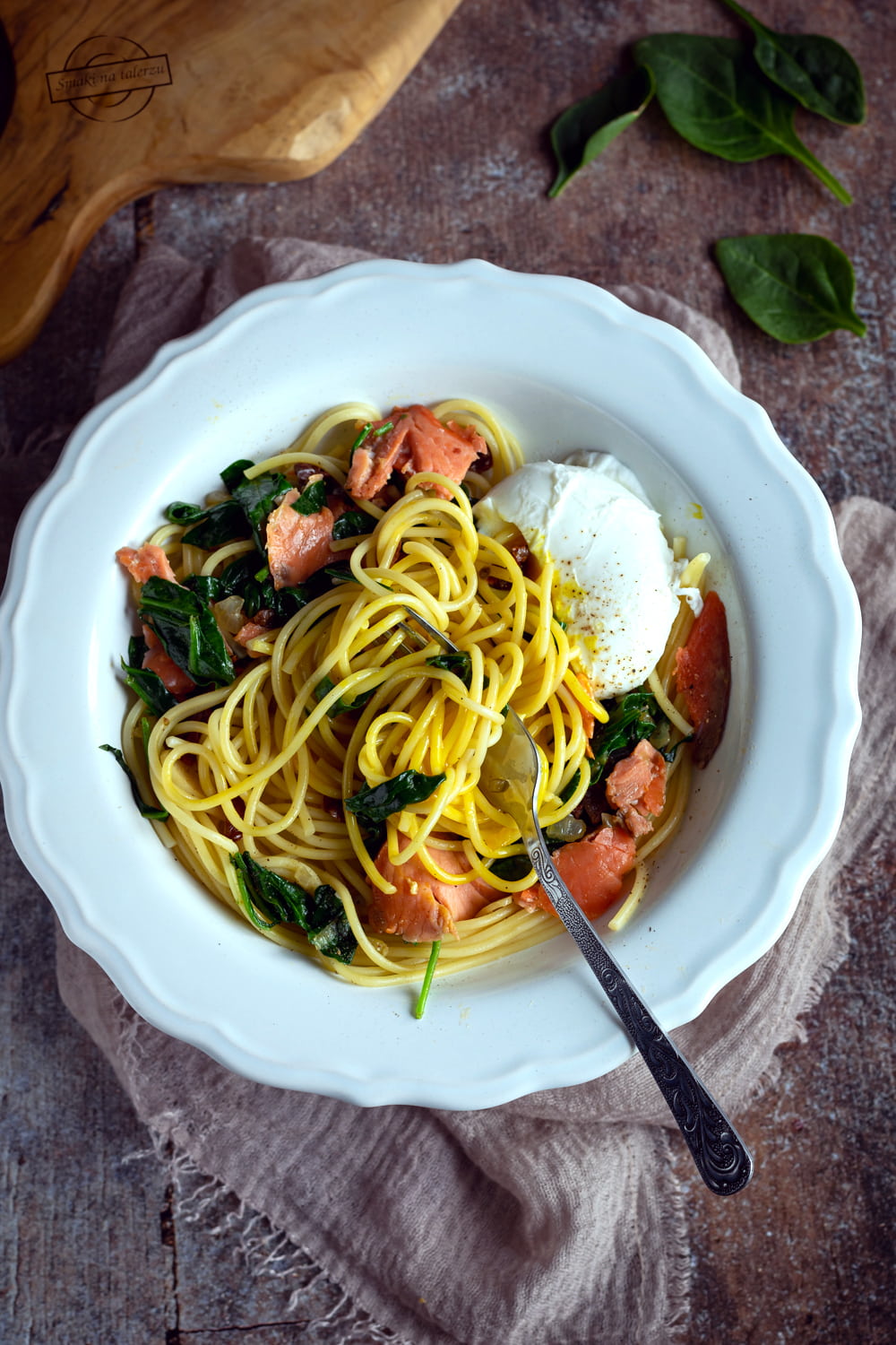 Do przygotowania dania wykorzystałam świeży szpinak oraz łososia wędzonego na zimno. Całość, aby była jeszcze bardziej