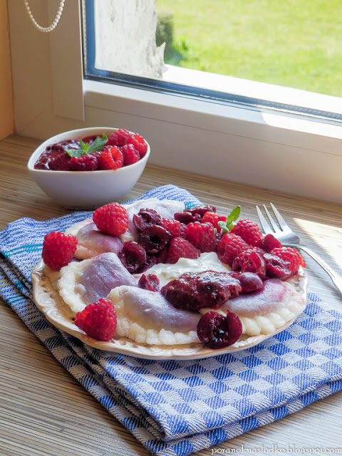 Pierogi z ricottą, wiśniami i borówkami podane z malinami, wiśniami oraz domową…