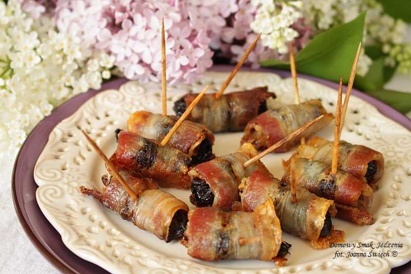 składniki: 30 śliwek kalifornijskich suszonych 30 plasterków boczku wędzonego 30 połówek orzecha…