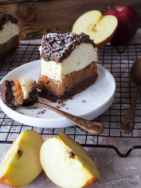 Szarlotka na kruchym, kakaowym cieście z warstwą soczystych i kwaśnych jabłek prażonych, na których znajduje się waniliowa pianka budyniowa oraz tarte ciasto na wierzchu.