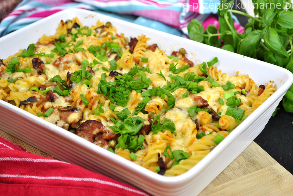 Zapiekanka makaronowa z kiełbasą i pieczarkami