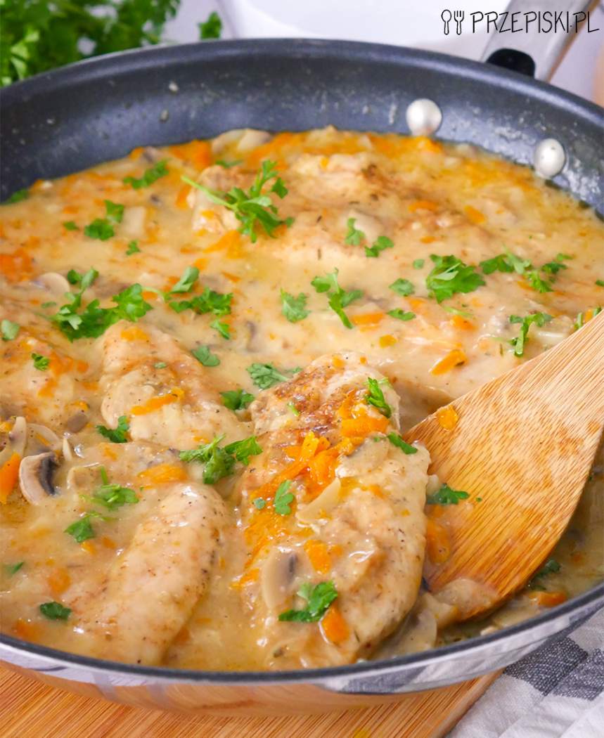 Kruche i delikatne mięso z kurczaka z pysznym kremowym sosem marchewkowo-pieczarkowym. Bardzo prosty i smaczny pomysł na rodzinny obiad.