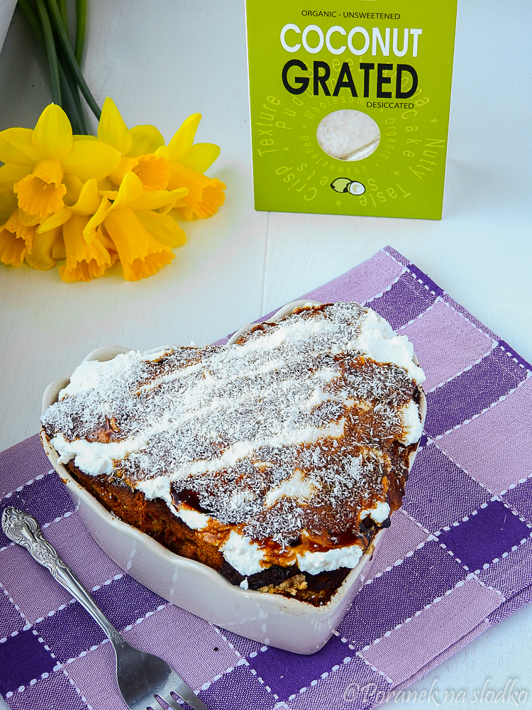 Przepis na deser piernikowy z korzennymi ciasteczkami, powidłem śliwkowym, waniliowym kremem z kaszy manny i polewą czekoladową.