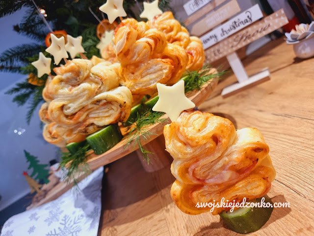 Pyszne choineczki z ciasta francuskiego, w środku do wyboru z wędzonym łososiem lub szyneczką. Pięknie się prezentują i można je jeść i na ciepło i na zimno. Spróbujcie zrobić takie na święta lub na Sylwestra, polecam