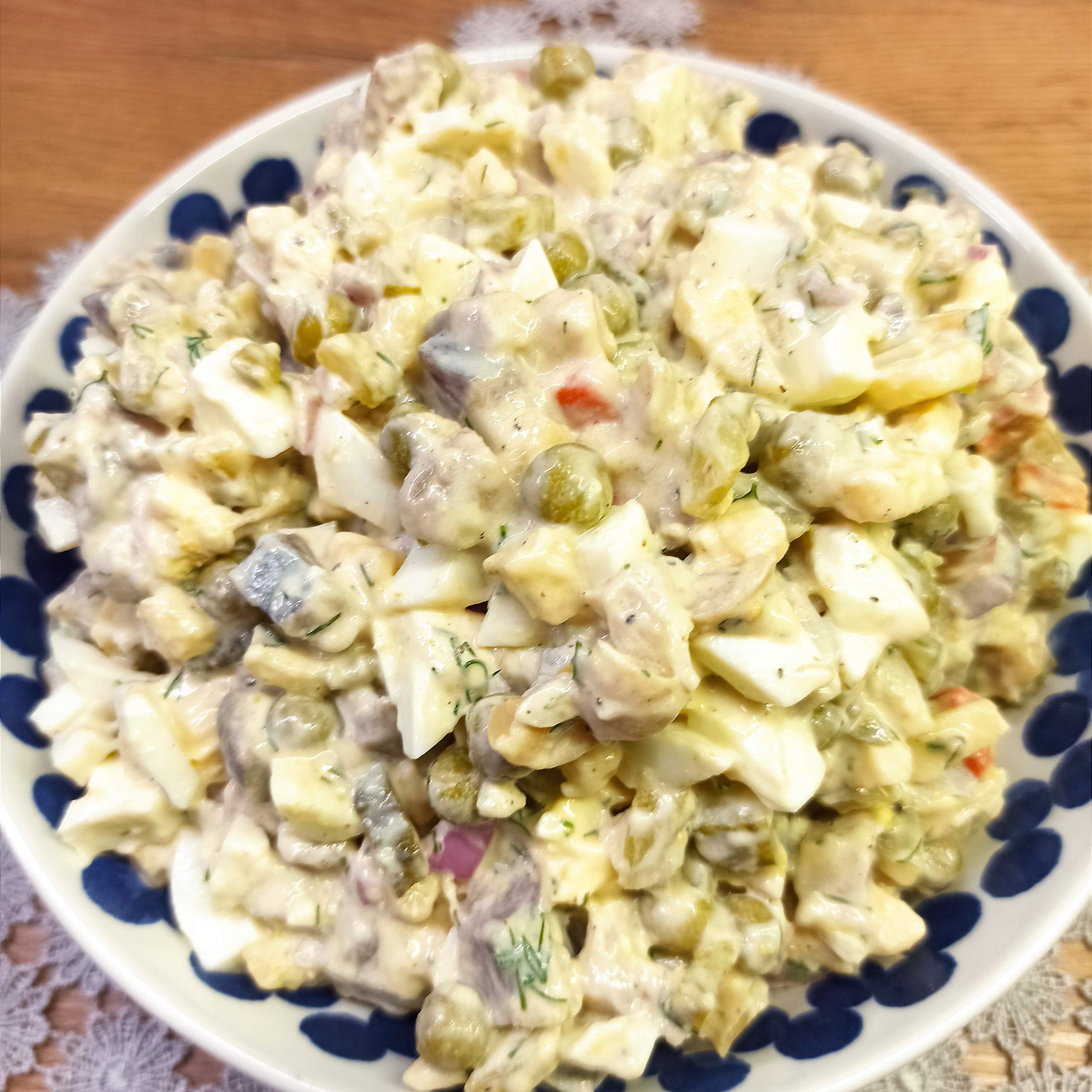 Wyśmienita, idealna na święta sałatka śledziowa z jajkiem, ogórkiem konserwowym, jabłkiem, szalotką, marynowanymi pieczarkami i groszkiem w sosie śmietanowo-majonezowym.