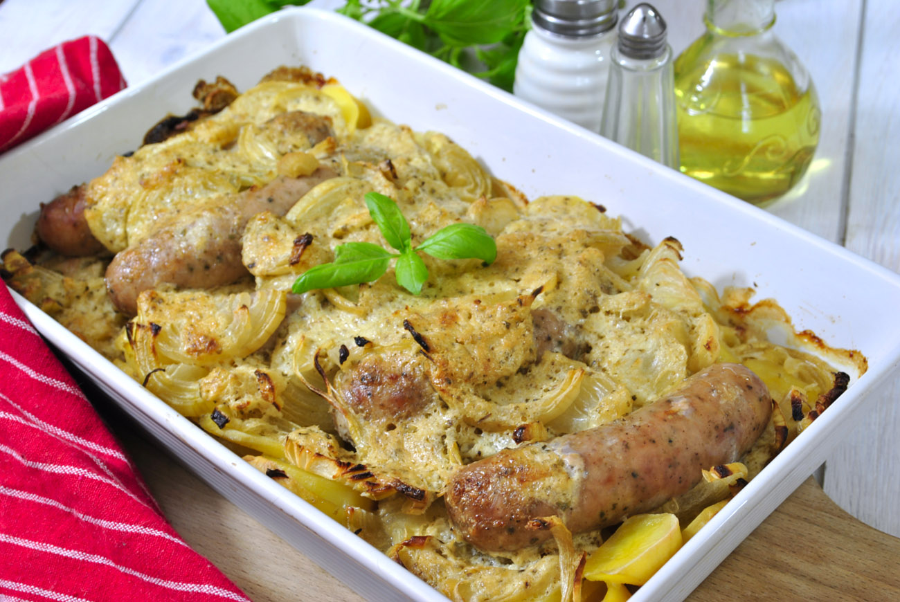Zapiekanka ziemniaczana z białą kiełbasą