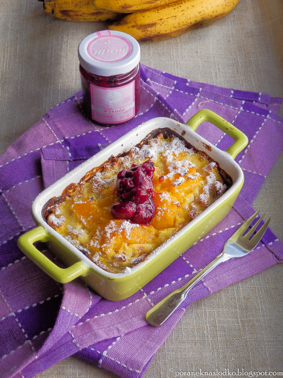 Zapiekanka twarogowa z makaronu orkiszowego bio i mango podana z konfiturą wiśniową…