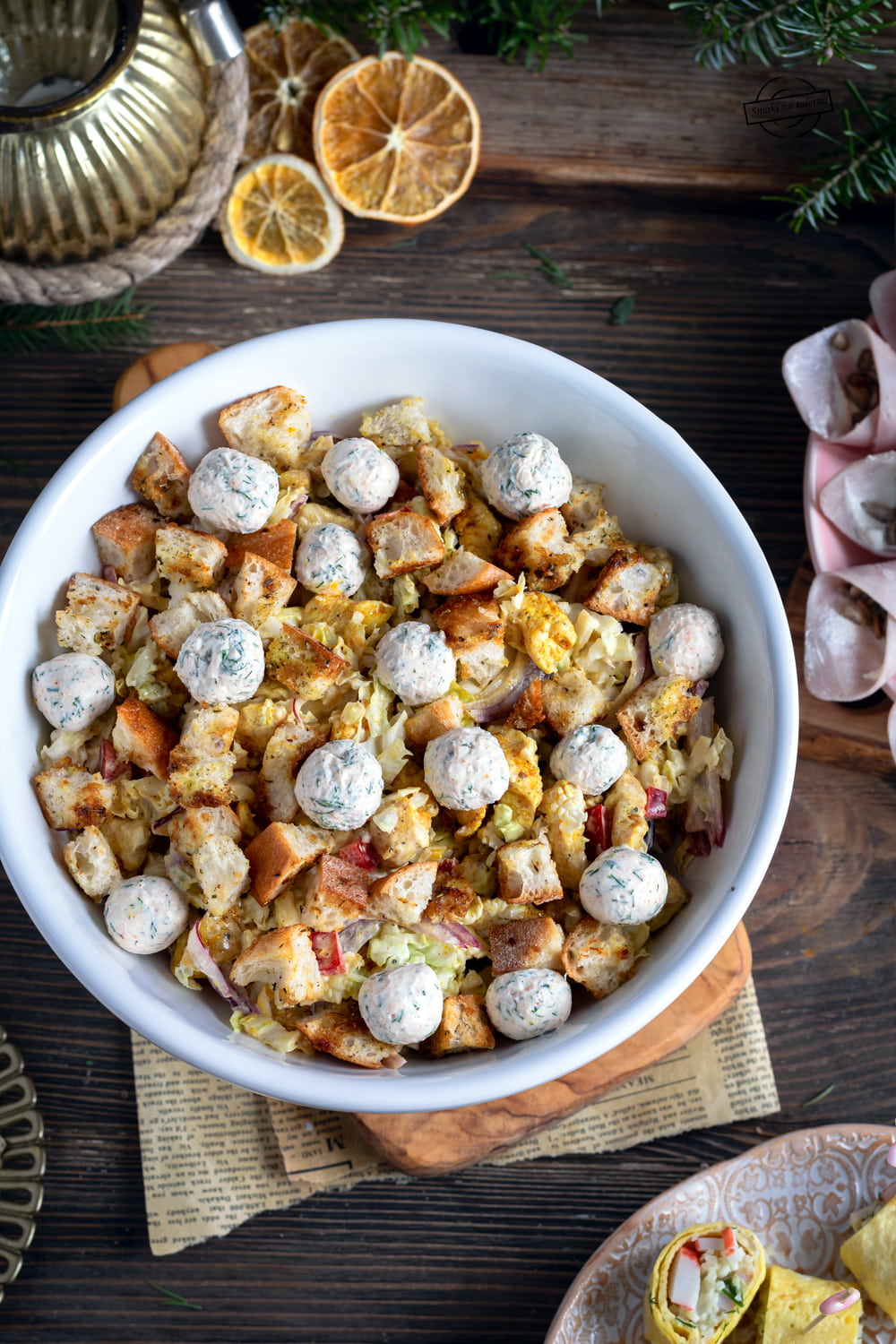 Sałatka z kapustą pekińską i kurczakiem, marynowaną czerwoną cebulą, papryką, kuleczkami serowymi i grzankami. Jest po prostu przepyszna.