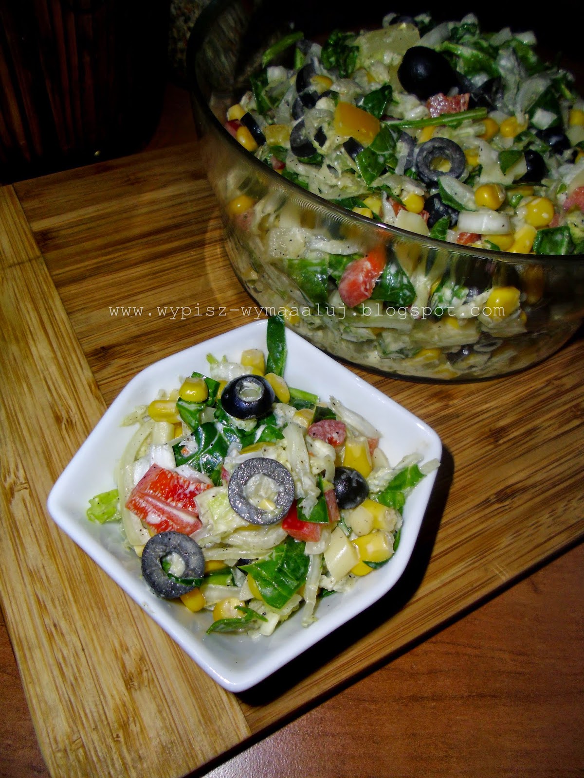 Przepyszna lekka sałatka, do której wykorzystałam pastę z zielonych oliwek przywiezioną z Malty. Można samemu ją przygotować przez zmiksowanie dowolnych oliwek z dodatkiem oliwy z oliwek.