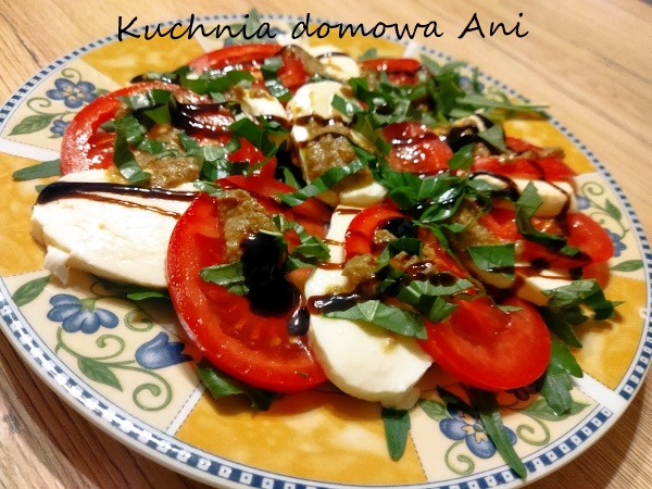 1 kulka mozzarelli 1 średni pomidor rukola pasta oliwkowa sólświeże listki bazyliisos balsamico