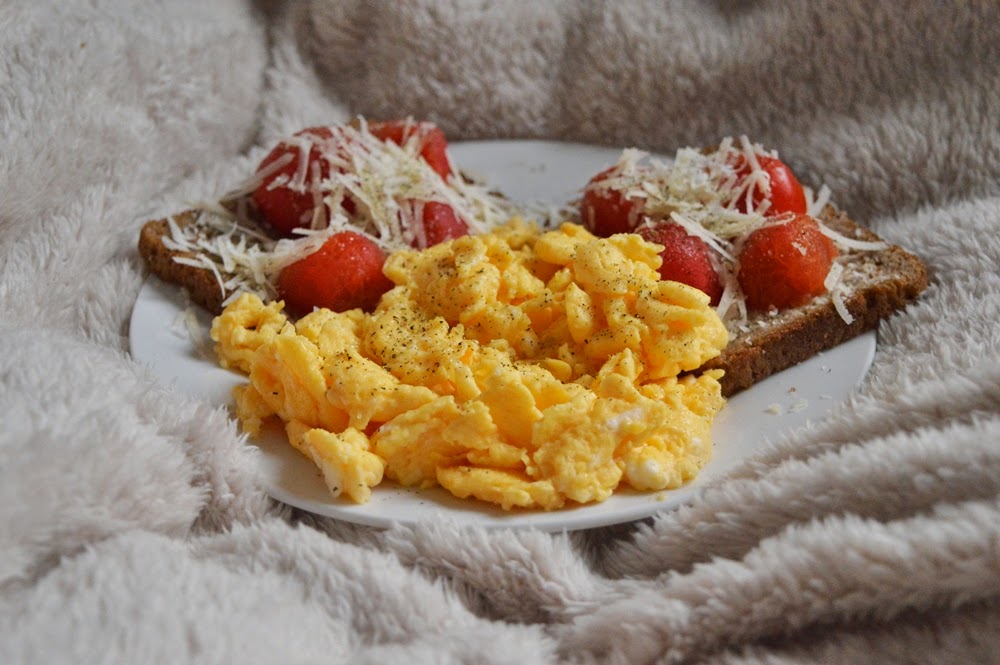 zwyczajna jajecznica, ze zwyczajnym chlebem żytnim, zwyczajnym masłem, zwyczajnymi pomidorkami i zwyczajnym…