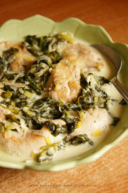 Składniki:– 1/2 kg filetu z kurczaka– 1 por– 1 op. świeżego szpinaku–…