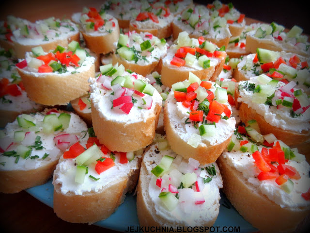 Bagietki z serkiem śmietankowym, koperkiem, ogórkiem i rzodkiewką.Bagietki z serkiem śmietankowym, koperkiem,…