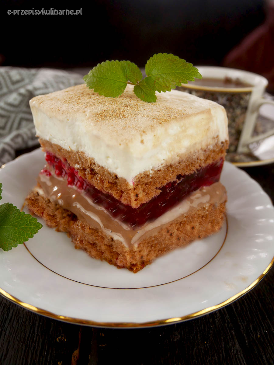 Ciasto Niezły Bajerant z masą z kajmakową, warstwą galaretki z malinami i…