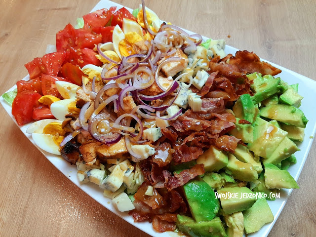 Pyszna kolorowa sałatka z soczystym kurczakiem,chrupiącym boczkiem, jajkiem serem pleśniowym i warzywami…