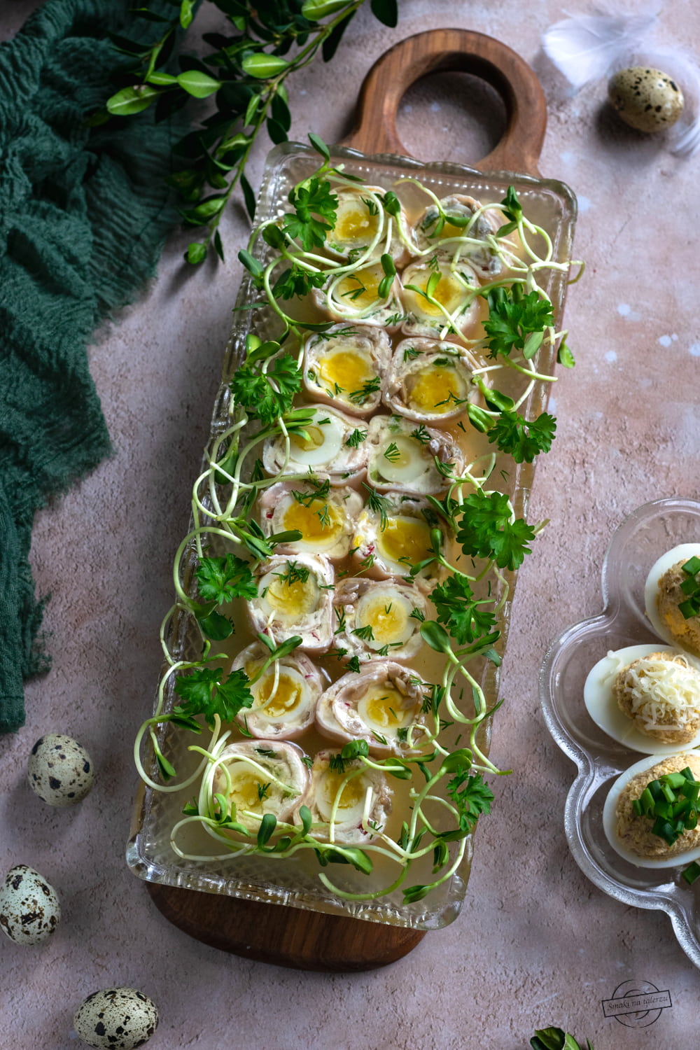 Jajka przepiórcze owinięte szynką posmarowaną serkiem chrzanowym z dodatkiem słonecznika, a całość zatopiona w galarecie. Takie roladki przygotowałam na zeszłoroczną Wielkanoc. Inspirację znalazłam na blogu Swojskie jedzonko.
