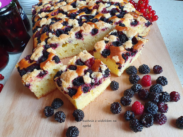 Ciasto widelcem mieszane z czarnymi malinami i kruszonką.