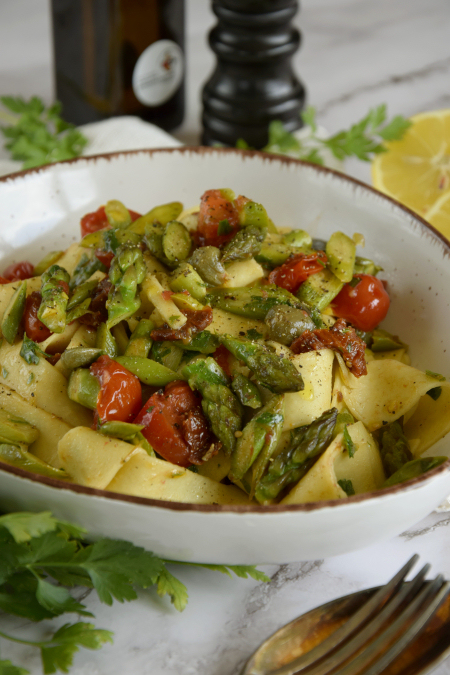 Kwintesencja wiosennego powiewu, orzeźwienia i lekkości – ten makaron ma to wszystko w sobie. Można poetycznie o jedzeniu, można ale lepiej spróbować, zachwycić się i dodać własne epitety. Najlepsze bo sezonowe zielone szparagi w połączeniu z suszonymi i żywymi pomidorami to już brzmi dobrze, ale bomba smakowa w tym