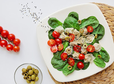 Przepis na sałatkę z uszkami z pieczarkami, pomidorkami koktajlowymi, świeżym szpinakiem i talarkami z oliwek