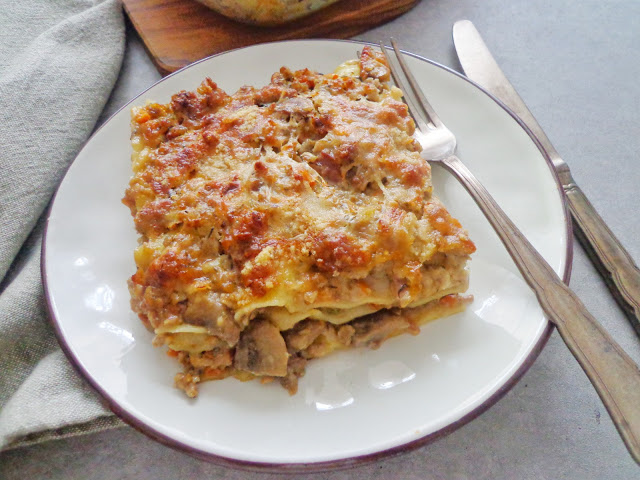 SKŁADNIKI 250 g makaronu typu lasagne100 g parmezanu Ragù mięsno-grzybowe250 g mięsa…