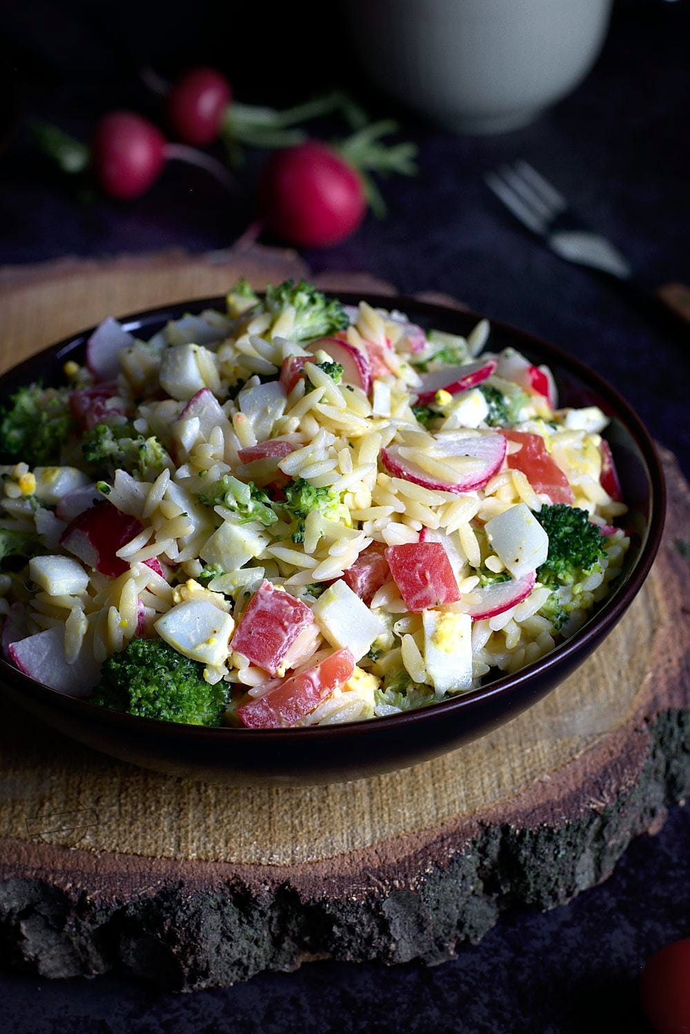 Na blogu jest już jedna sałatka z makaronem orzo i brokułem, natomiast ta dzisiejsza, można powiedzieć, jest bardziej wiosenna, warzywna. Oprócz brokuła mamy tutaj jeszcze pomidora i rzodkiewki. No i jajka, a jak! Bo każda sałatka z jajkami jest po prostu lepsza
