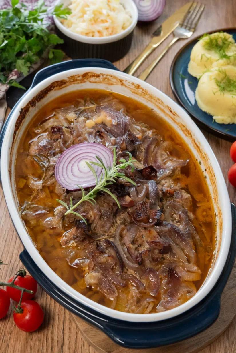 Karkówka pieczona w plastrach z cebulą