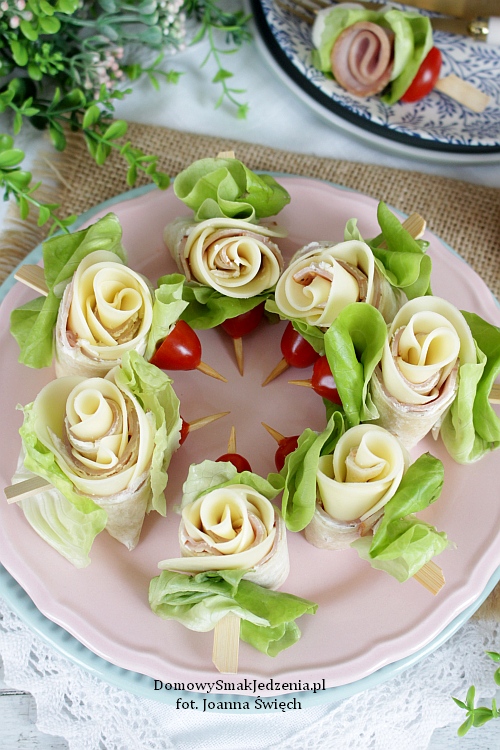 Pomidorki przekrawamy na pół. Z sera wycinamy kółka a następnie przekrawamy je na pół. Tortille smarujemy serkiem. Na serku układamy plasterki szynki, jeden obok drugiego. Następnie kroimy w paski ok. 4 cm szerokie. Na każdym pasku układamy połówki kółek sera