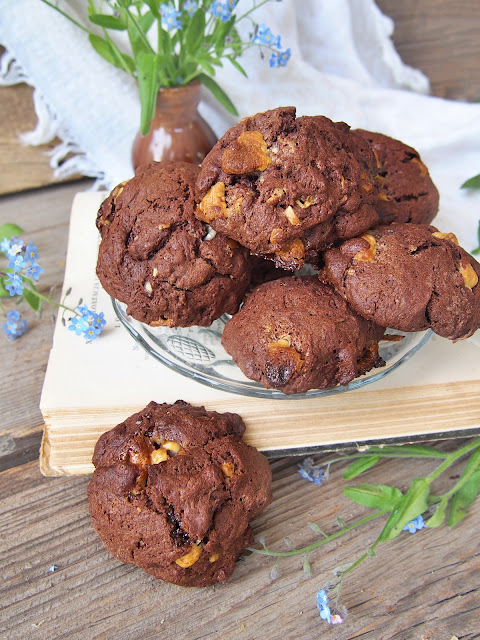 Te ciasteczka wyglądem jakoś specjalnie nie zachwycają, ale uwierzcie mi na słowo, smakują genialnie. To nieco prostsza wersja ciasteczek czekoladowych tak lubianych przez moją córkę, bez miksowania i ucierania. Wystarczy wymieszać w odpowiedniej kolejności składniki, upiec i cieszyć się pyszny deserem. Ja dodałam do nich posiekaną białą czekoladę,