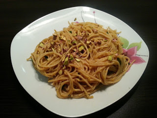 Pełnoziarniste spaghetti z sosem cukiniowo – pomidorowym z pistacjami