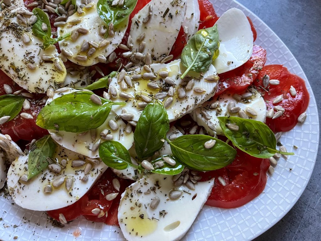 Caprese, czyli sałatka numer jeden u mnie, z uwagi na ekspresowy czas przygotowania! Teraz, kiedy pomidory są tak pyszne, zdecydowanie warto ją przygotować! Moja wersja jest z dodatkiem ziaren słonecznika, które nadają tutaj chrupkości i dodatkowego źródła tłuszczu oraz błonnika pokarmowego. Sałatka sprawdzi się zarówno jako dodatek do innego