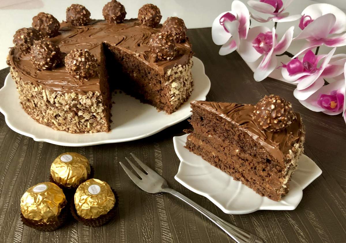 Tort Ferrero Rocher Mocno czekoladowe ciasto przełożone masą truflową z dodatkiem chrupiących…