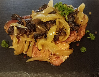 1 kg karkówki2 duże cebule 100 g smażonych pieczarek 2 liście laurowe 150 ml zimnej wody 10 łyżek oleju 1/2 łyżeczki pieprzu grubo mielonego przyprawy- peklo sól , pieprz czarny , słodka papryka , majeranek