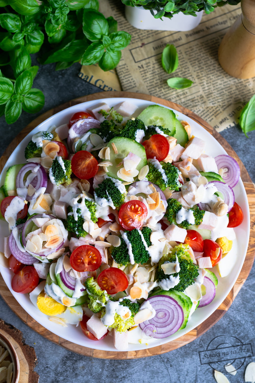 Brokuł, jajka, pomidorki – to trio zawsze świetnie gra ze sobą w sałatkach i jest pyszną bazą do powstawania nowych smakowitych połączeń. U mnie dziś sałatka dodatkowo wzbogacona pysznym, chrupiącym zielonym ogórkiem, krążkami cebulki, wędzonym kurczakiem, płatkami migdałowymi oraz sosem czosnkowym. Pycha!