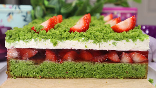 czyli piękny, zielony biszkopt, przełożony warstwami truskawek w galaretce oraz