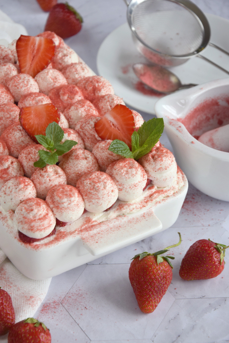 Klasyczne tiramisu samo w sobie jest pyszne, ale truskawkowe to inny wymiar przyjemności. Zwłaszcza teraz gdy truskawki są najlepsze, najsłodsze i najbardziej aromatyczne. W tym cieście znajdziemy je aż w kilku formach – syropu, którym namaczane są biszkopty i który dodajemy do kremu, plasterków tych najdorodniejszych sztuk między