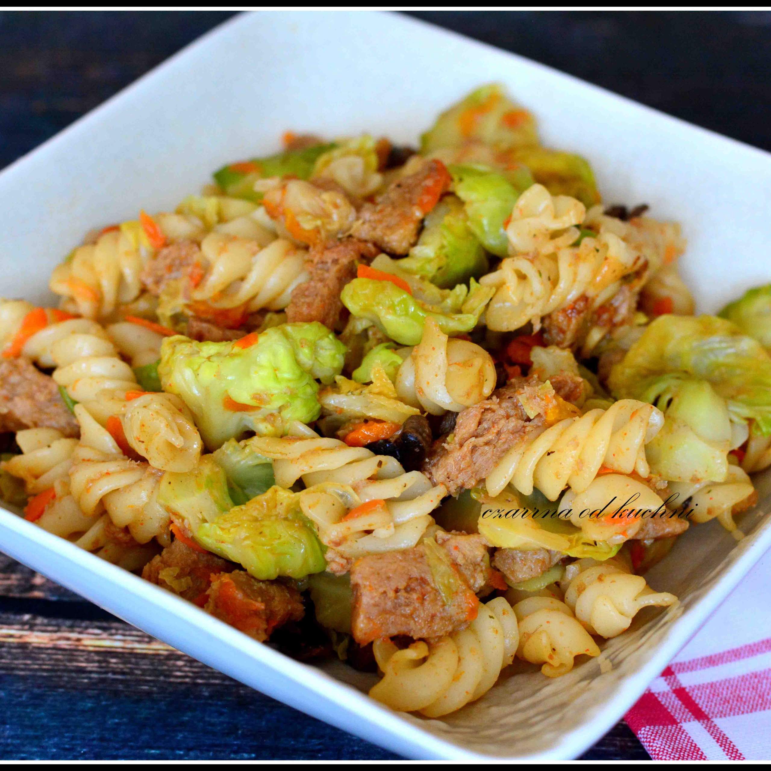Składniki: 150 g makaronu 1 opakowanie kotletów sojowych 300 g brukselki 1/2…
