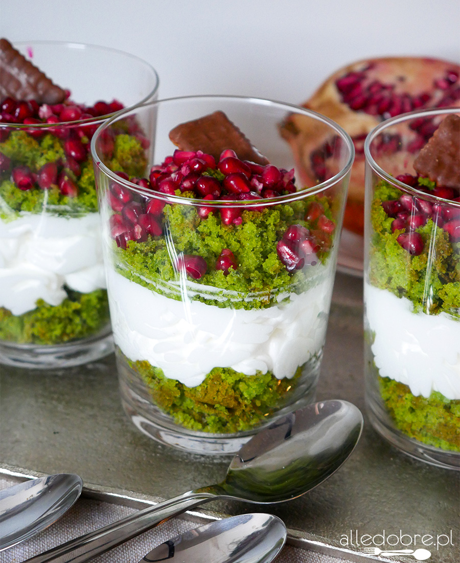 Deser leśny mech to warstwowy smakołyk złożony z ciasta szpinakowego i kremu śmietanowego posypanego granatem. Świetnie sprawdzi się na rodzinnych imprezach, ponieważ jest efektowny i niezwykle smaczny!