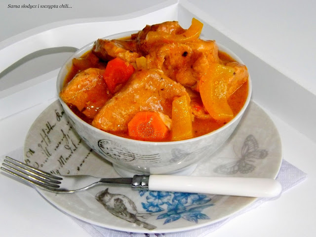 Pyszny aromatyczny gulasz schabowy w sosie słodko-kwaśnym z papryką konserwową i marchewką.Zapraszam…