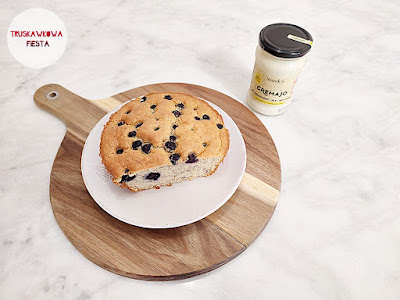 Składniki:2 jaja50 g erytrytolu50 g Cremajo 20%100 g banana bez skórki100 g mąki ryżowej1 płaska łyżeczka proszku do pieczeniaaromat50 g borówek amerykańskich