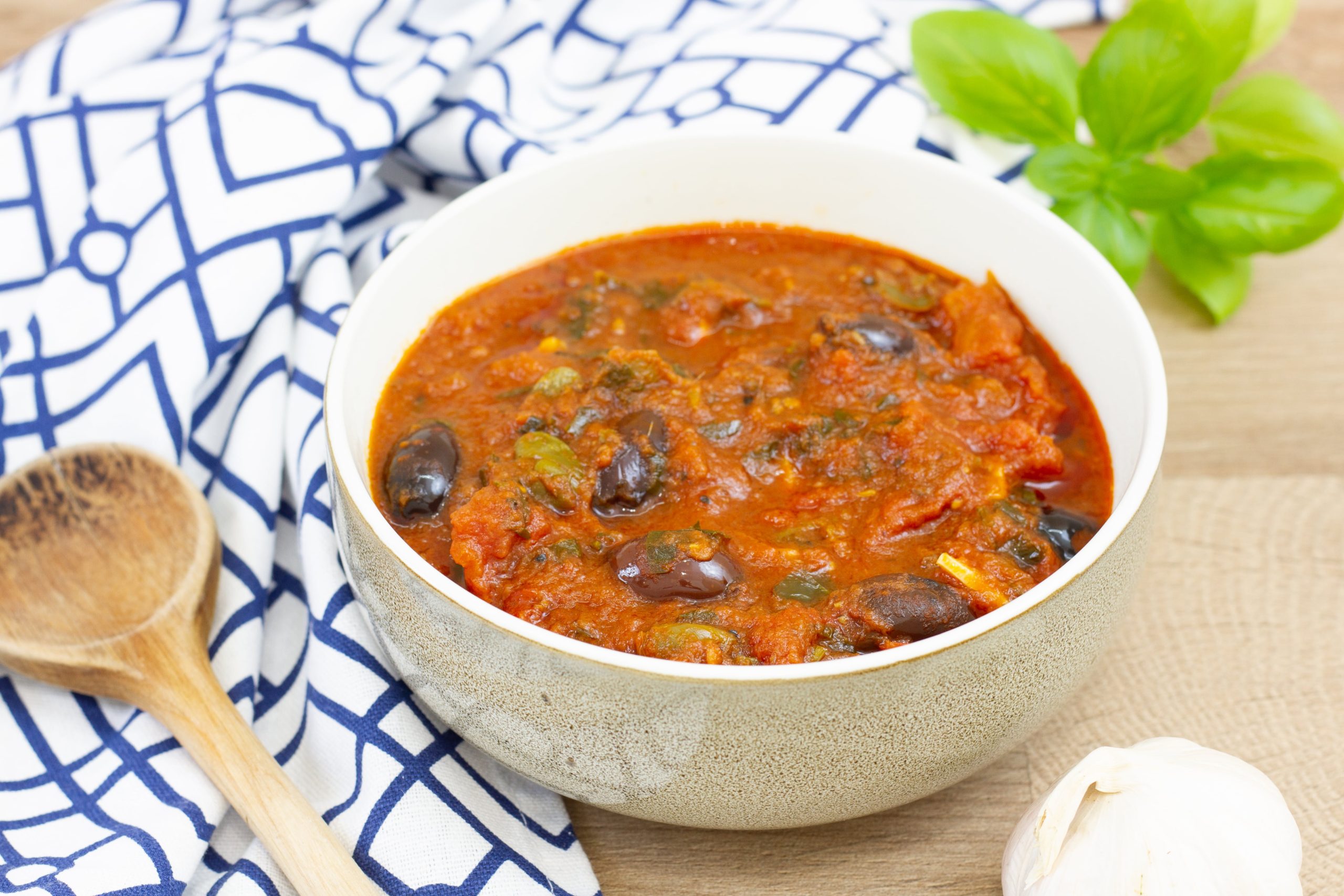 Szybki sos puttanesca z pomidorów, filetów anchois, kaparów, oliwek i ziół jest…