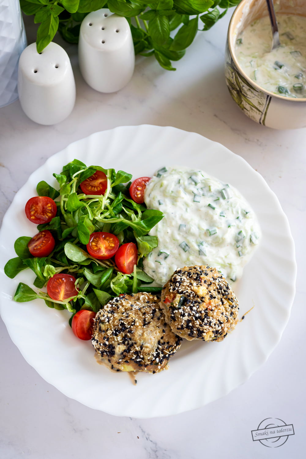 Pieczone kotleciki drobiowe z posiekanymi warzywami podałam dla siebie razem z roszponką i tzatzikami. Moje chłopaki dodatkowo mieli porcję
