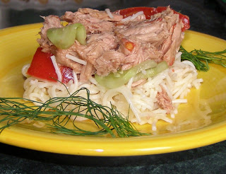 Składniki: makaron nitki 15 dag, tuńczyk w sosie własnym 2 puszki, ogórek…