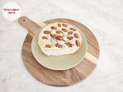 Składniki:2 jaja50 g erytrytolu100 g banana bez skórki250 g ricotty40 g budyniu śmietankowego10 g wiórków kokosowych20 g migdałów