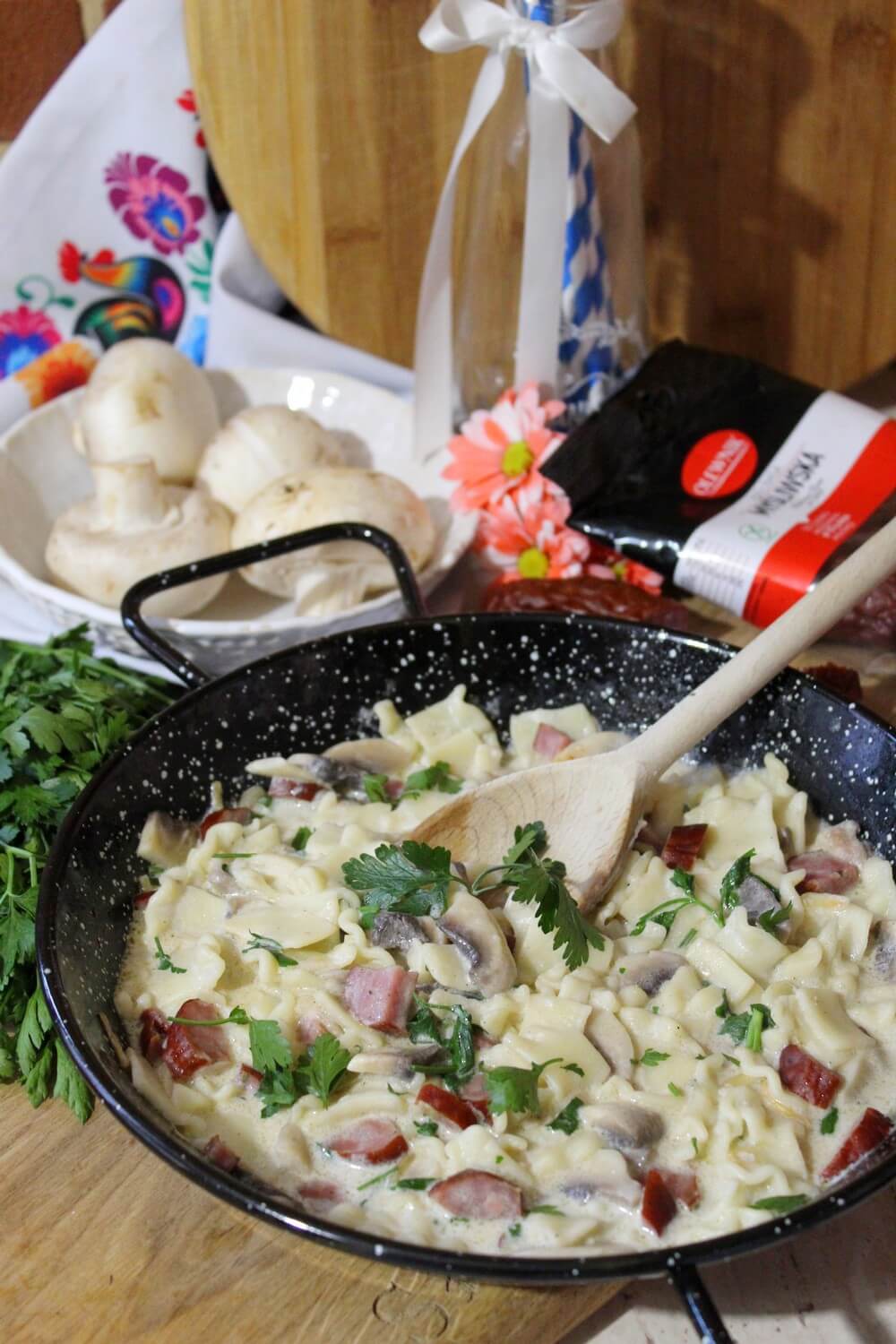 Makaron z kiełbasą myśliwską i pieczarkami – szybki obiad