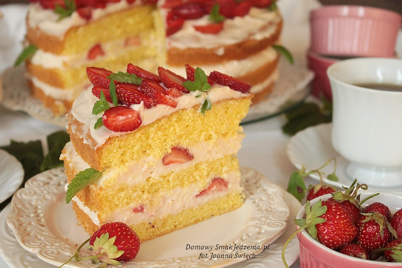 delikatne ciasto biszkoptowe z kremem śmietanowym i truskawkami