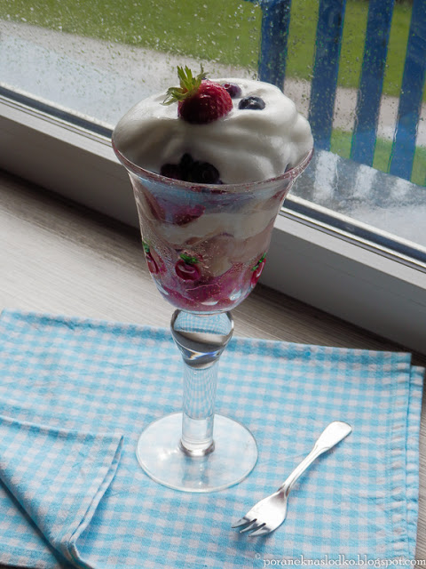 Przekładaniec z pierogów nadzianych truskawkami*, truskawek,kokosowego mascarpone**, borówek i mlecznej pianki*z organicznej…