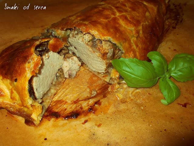 Otulona przyprawami polędwiczka wieprzowa zapiekana z pieczarkami i zamknięta w chrupiącym cieście…