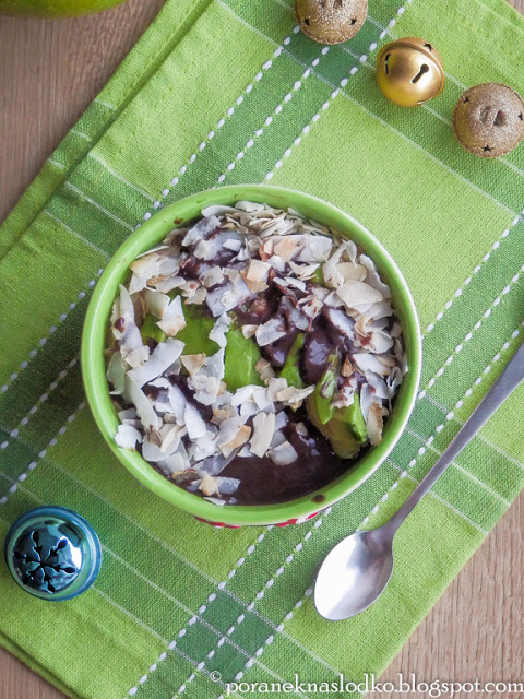 Owsianka na mleku migdałowym z waniliowym „smoothie mixem” podana z awokado, budyniem…