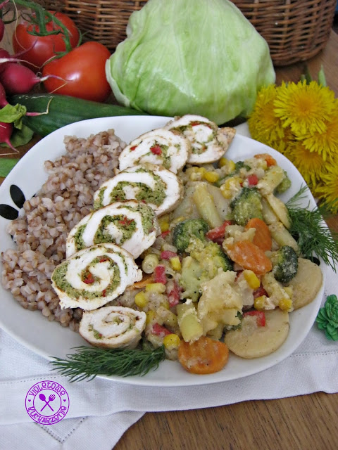 Roladki z pastą brokułowo paprykową z dodatkiem warzyw w śmietanie i kaszą
