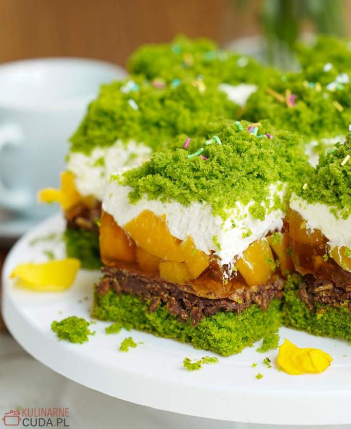 Czytaj DalejCiasto szpinakowe z brzoskwiniami zatopionymi w galaretce, chrupiącą wkładką i kremem śmietankowym.